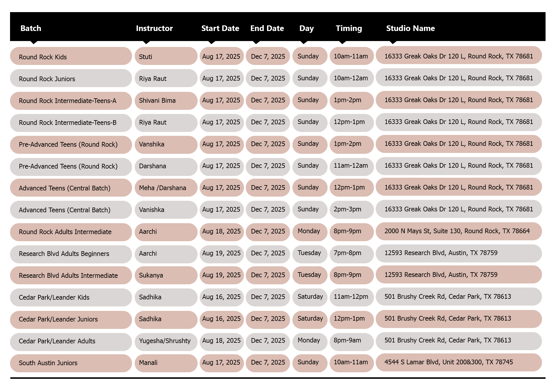 Intermediate, pre-advanced and advanced batches are by consultation only. For all batches marked with **, kindly send us a video at agni.austin@gmail.com before registering (if you are new to Agni Dance Academy) or check with the instructor (if you are already a part of Agni)
